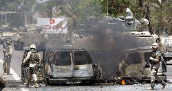 US soldiers inspect the site of an attack on a private security firm convoy in Iraq